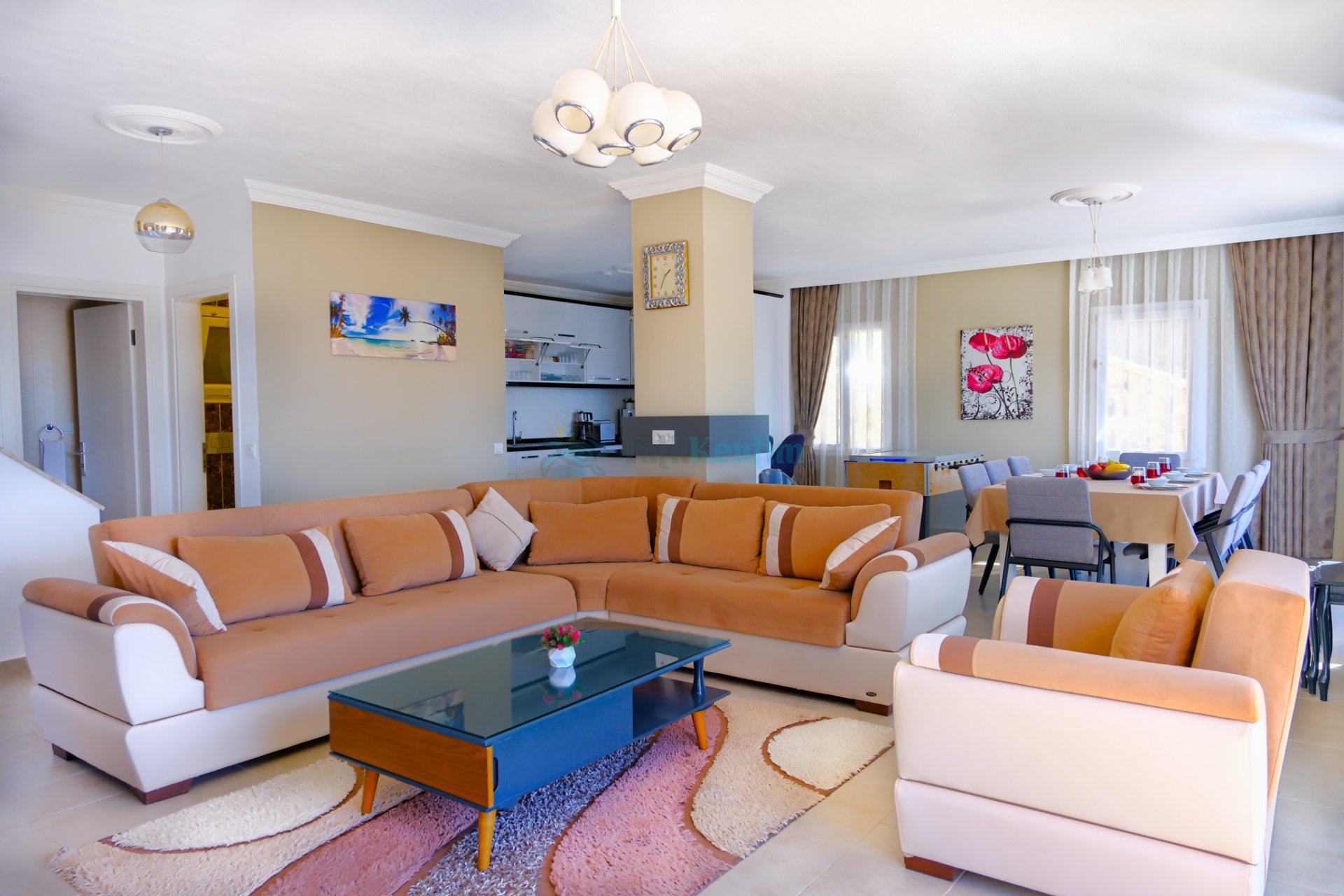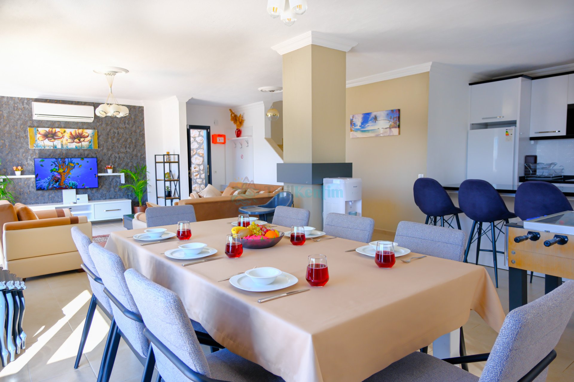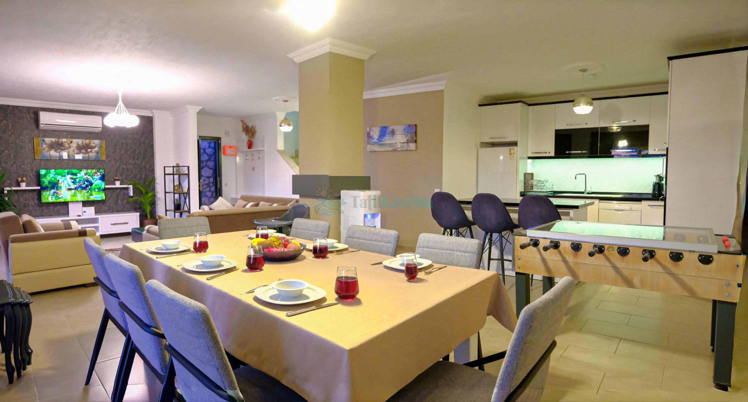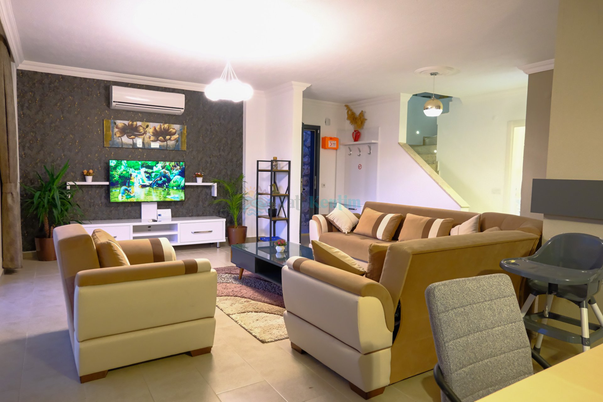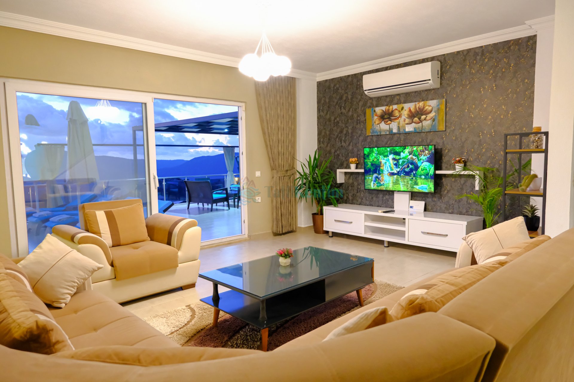 Villamızın salonu içerisinde, koltuk takımı, orta sehpa, TV, TV ünitesi, klima, uydu alıcısı yer almaktadır.