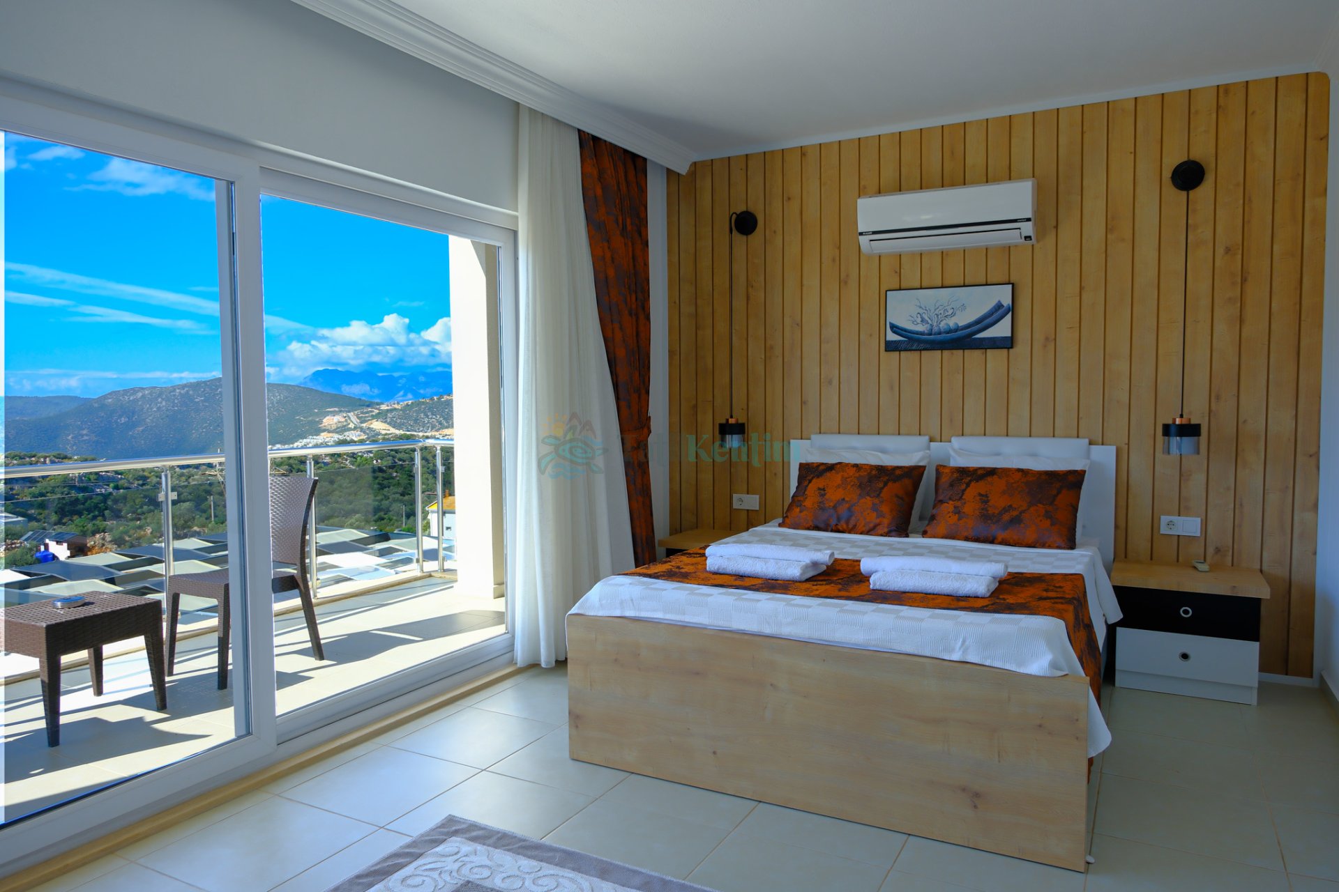 Kiralık villanın bu yatak odası içerisinde, 1 adet çift kişilik yatak, klima, elbise dolabı, komodin, makyaj masası, banyo ve tuvalet bulunmaktadır.