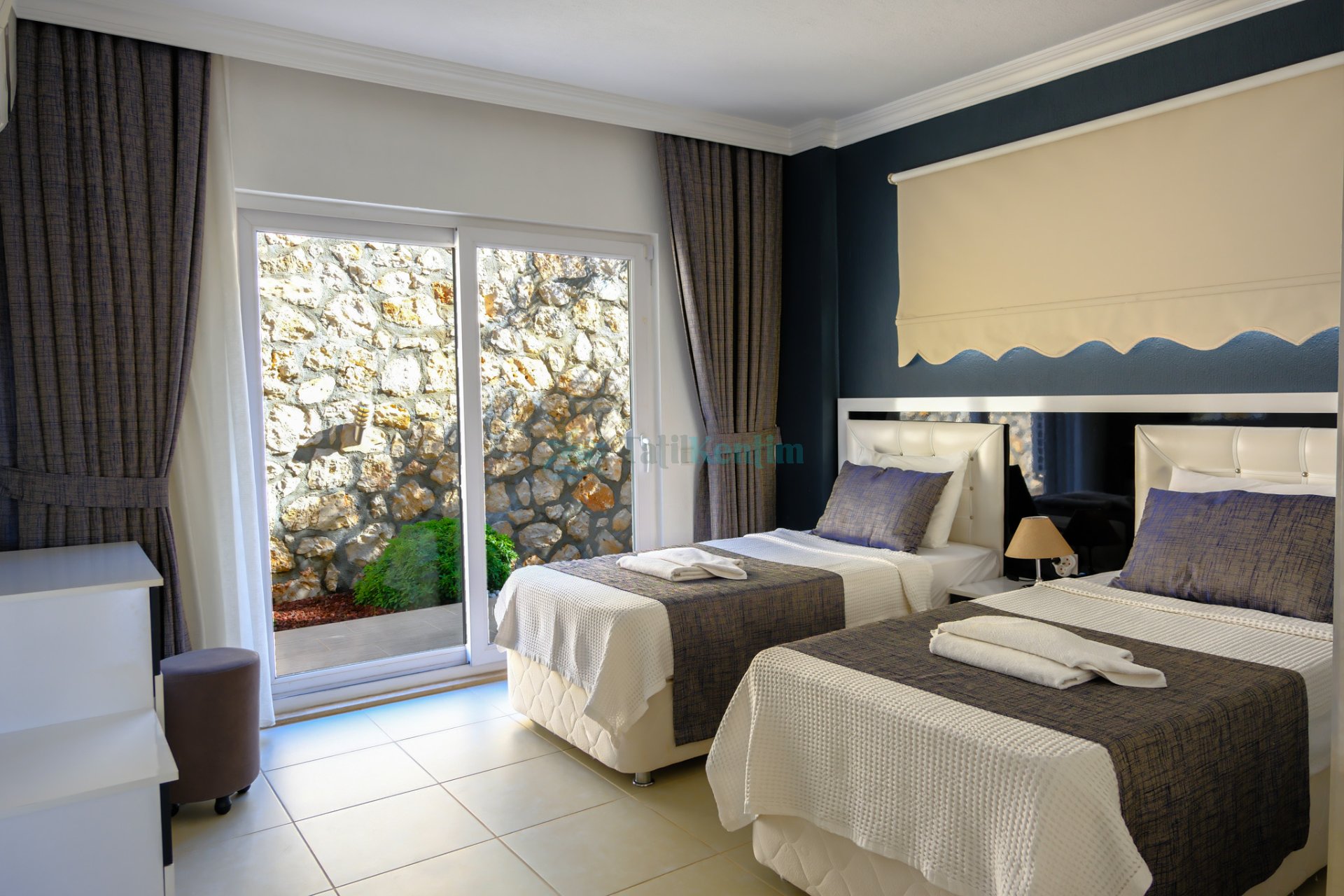 Bu yatak odası içerinde ise 2 adet tek kişilik yatak, klima, elbise dolabı, komodin, makyaj masası, banyo, ve tuvalet bulunmaktadır.