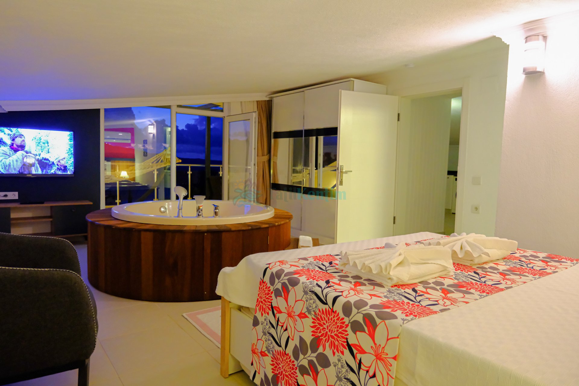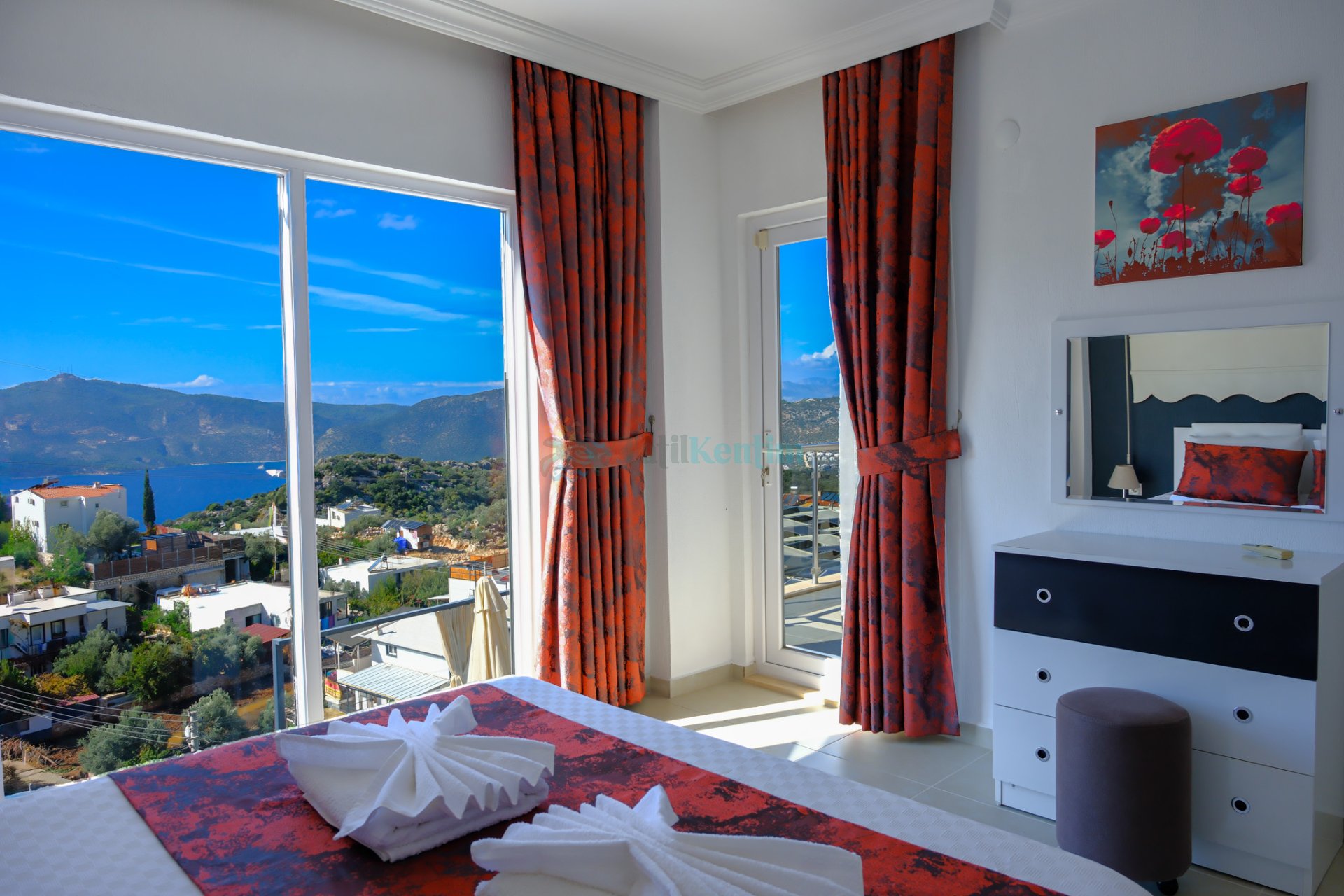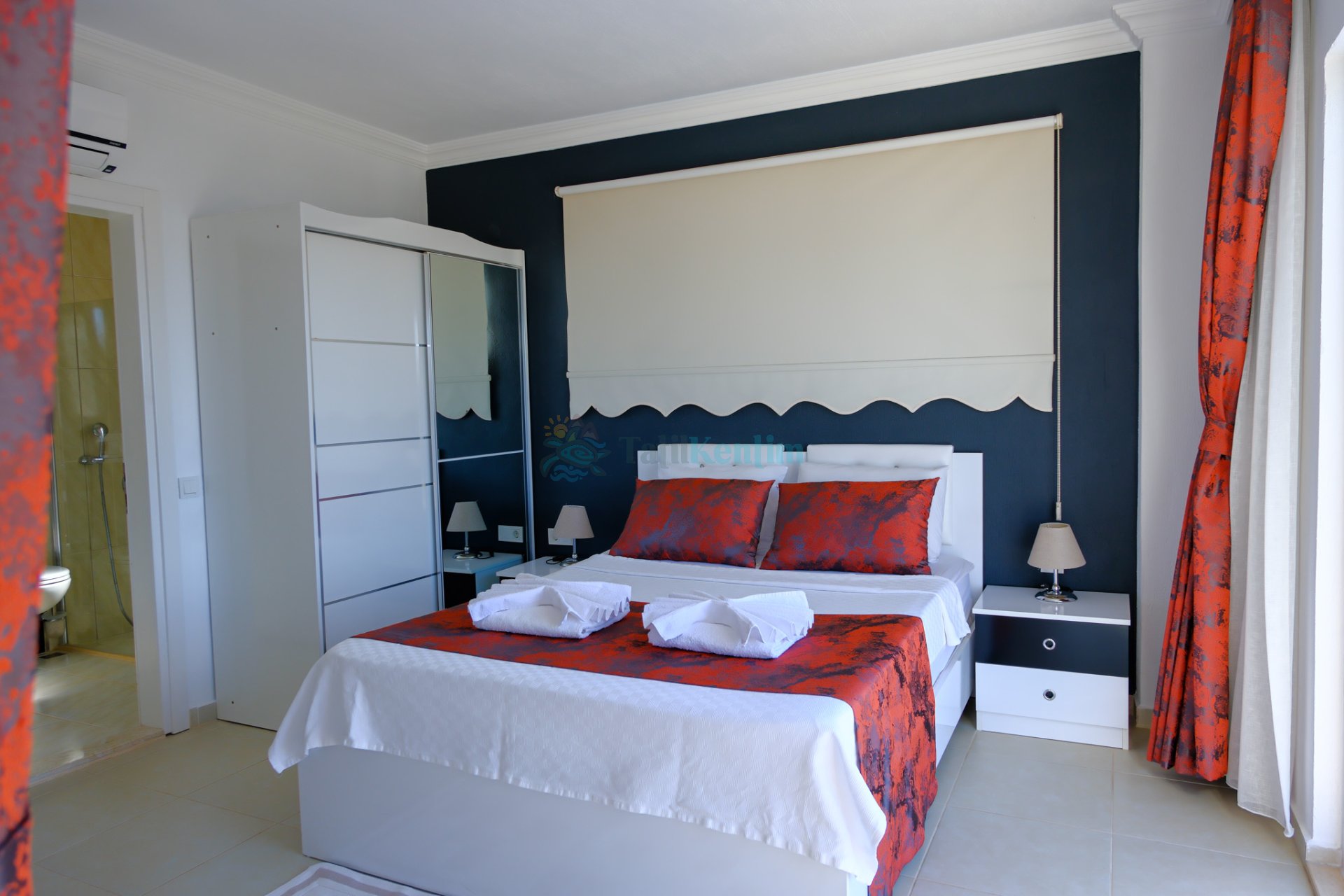 Tatil villamıza ait bu yatak odası içerisinde, 1 adet çift kişilik yatak, klima, elbise dolabı, komodin, makyaj masası, TV, banyo ve tuvalet alanları bulunmaktadır.