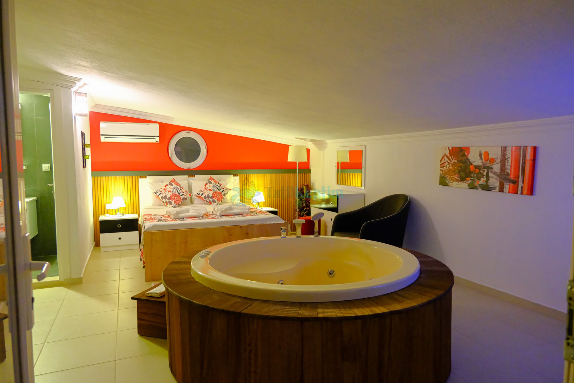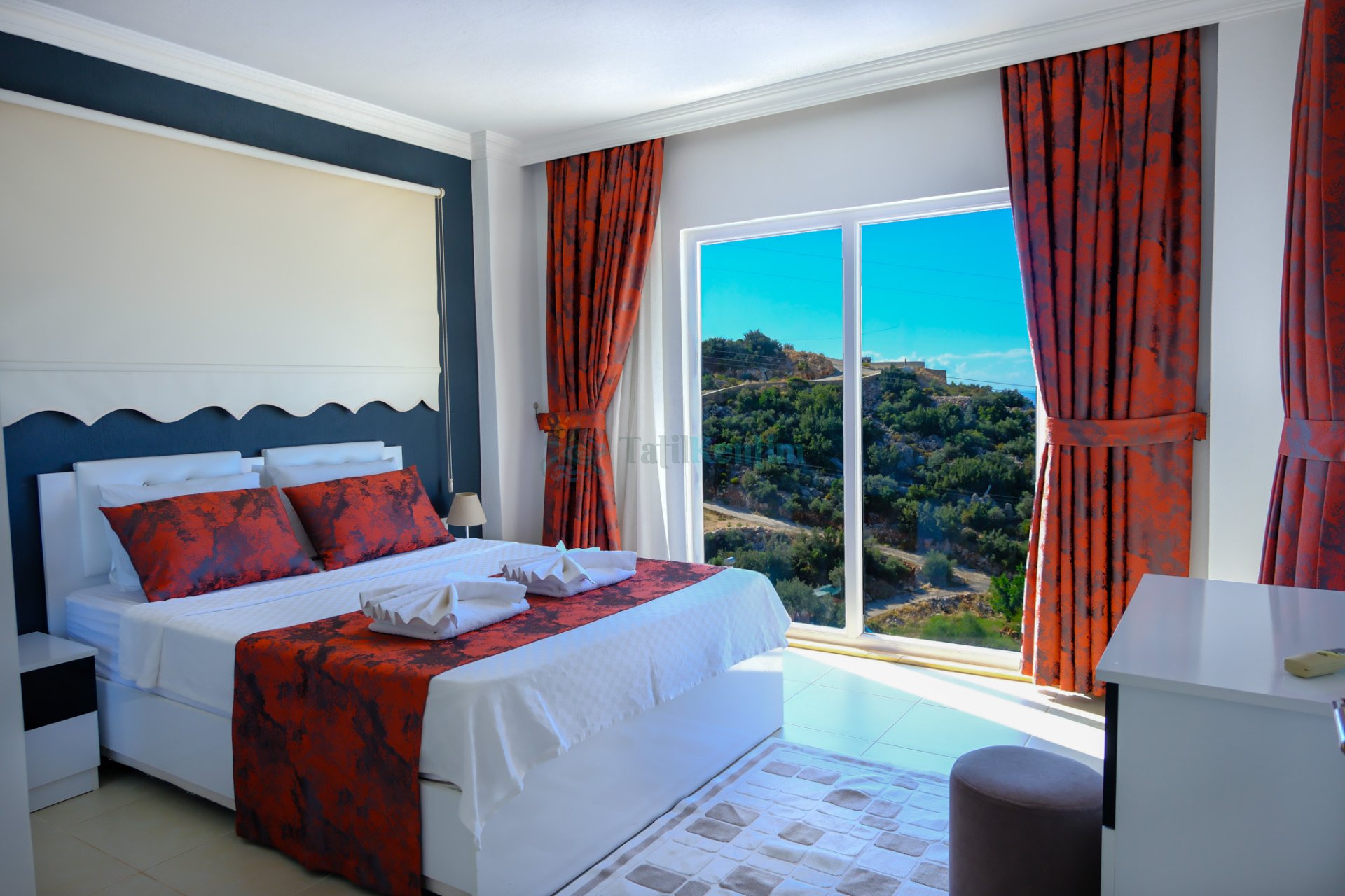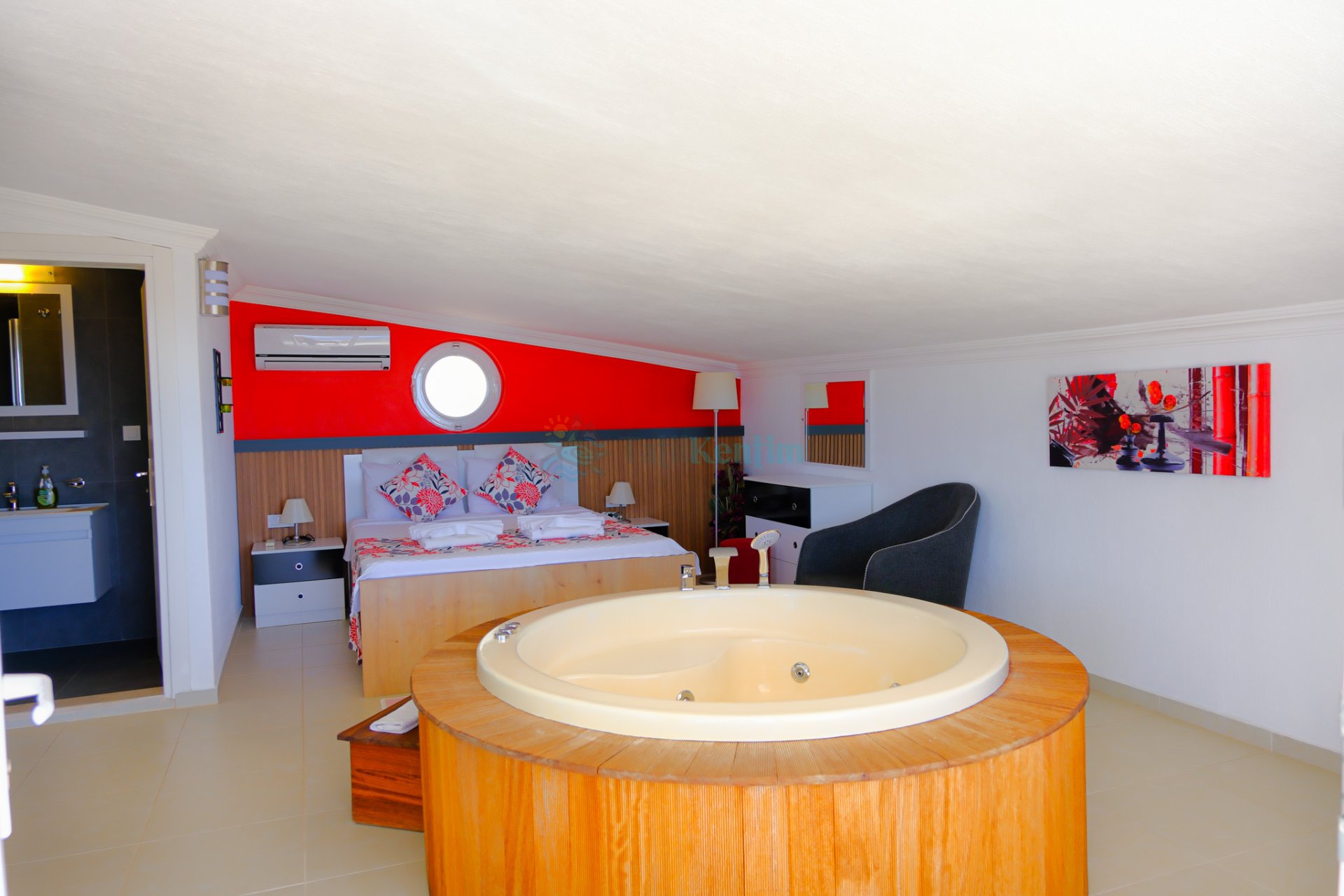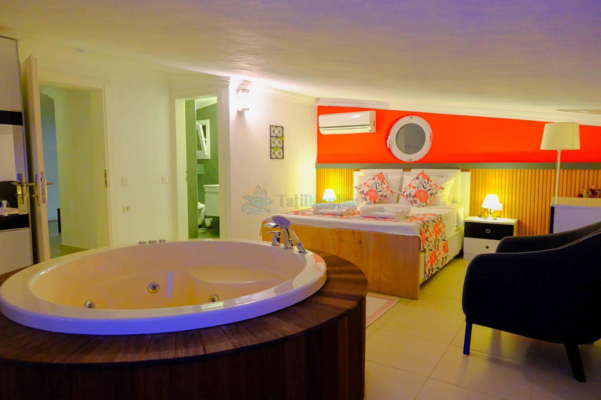 Tatil villamıza ait bu yatak odası içerisinde, 1 adet çift kişilik yatak, klima, elbise dolabı, komodin, makyaj masası, TV, banyo ve tuvalet alanları bulunmaktadır.