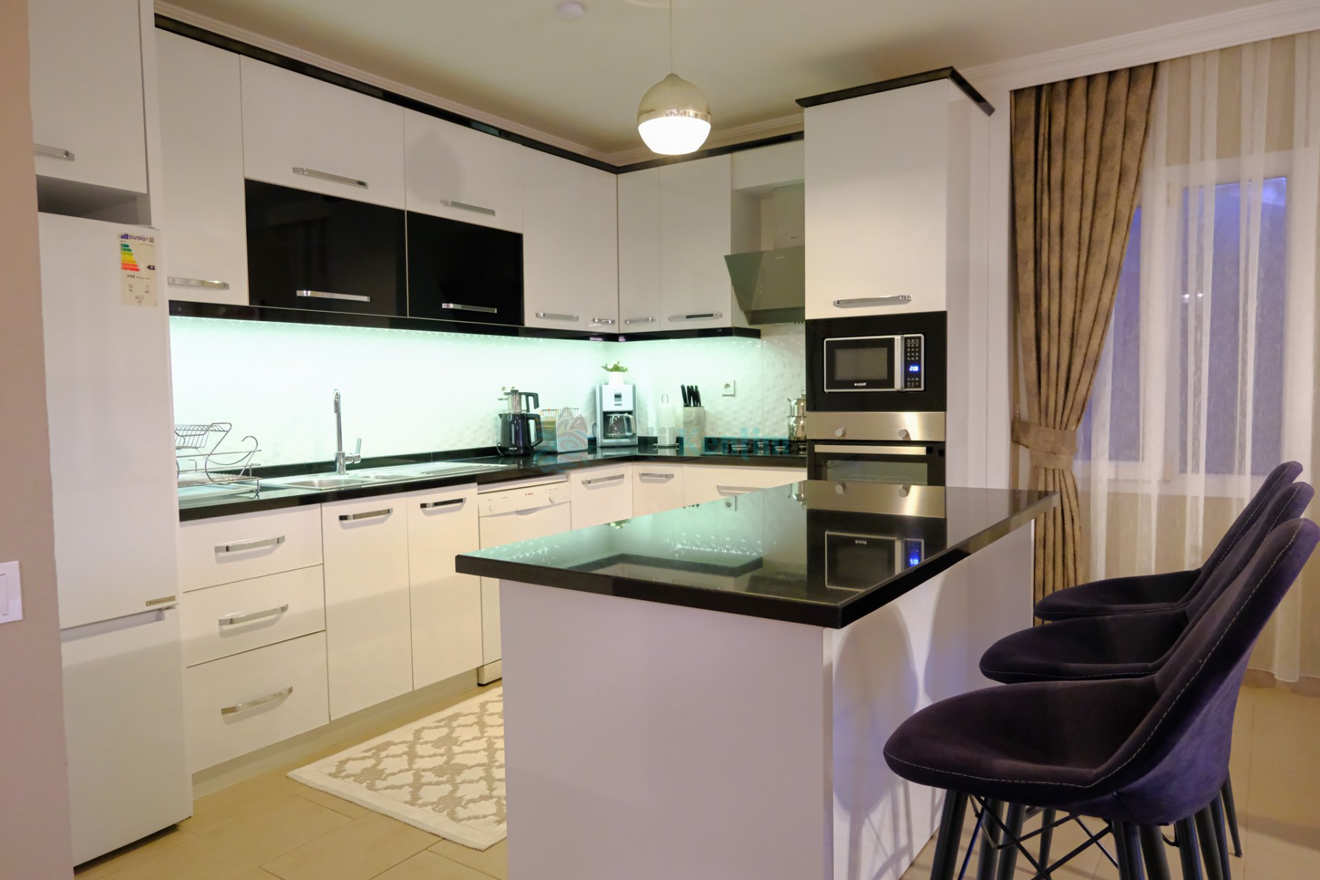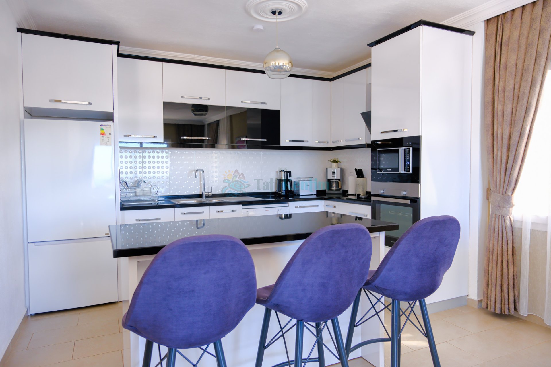 Yazlığımızın Amerikan mutfağı içerisinde, buzdolabı, bulaşık makinası, çamaşır makinası, yemek masası, yemek takımı, ankastre fırın, tost makinası, ankastre ocak, çaydanlık, su ısıtıcısı, tava, tencere takımı ve gerekli olan tüm mutfak gereçleri yer almaktadır.