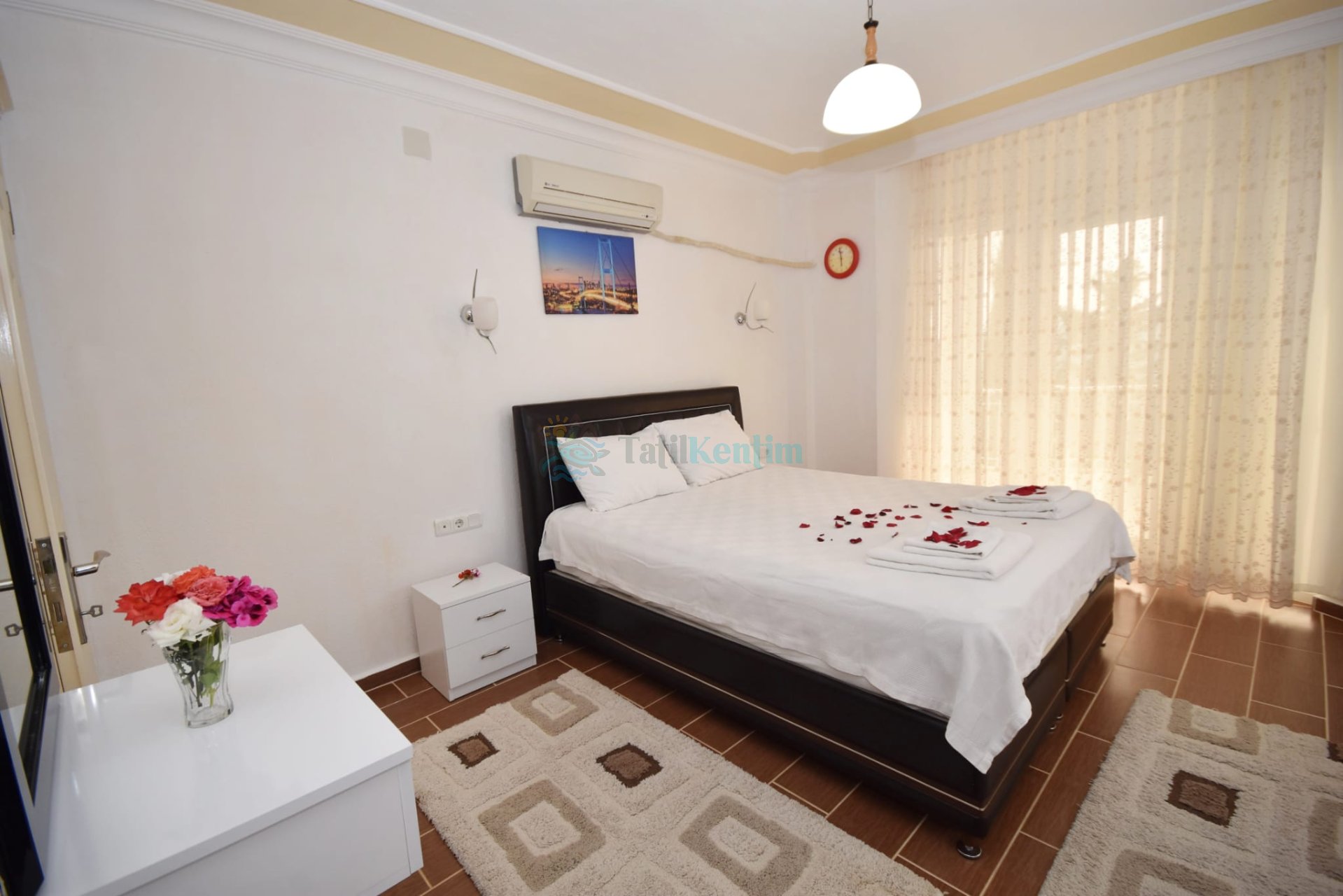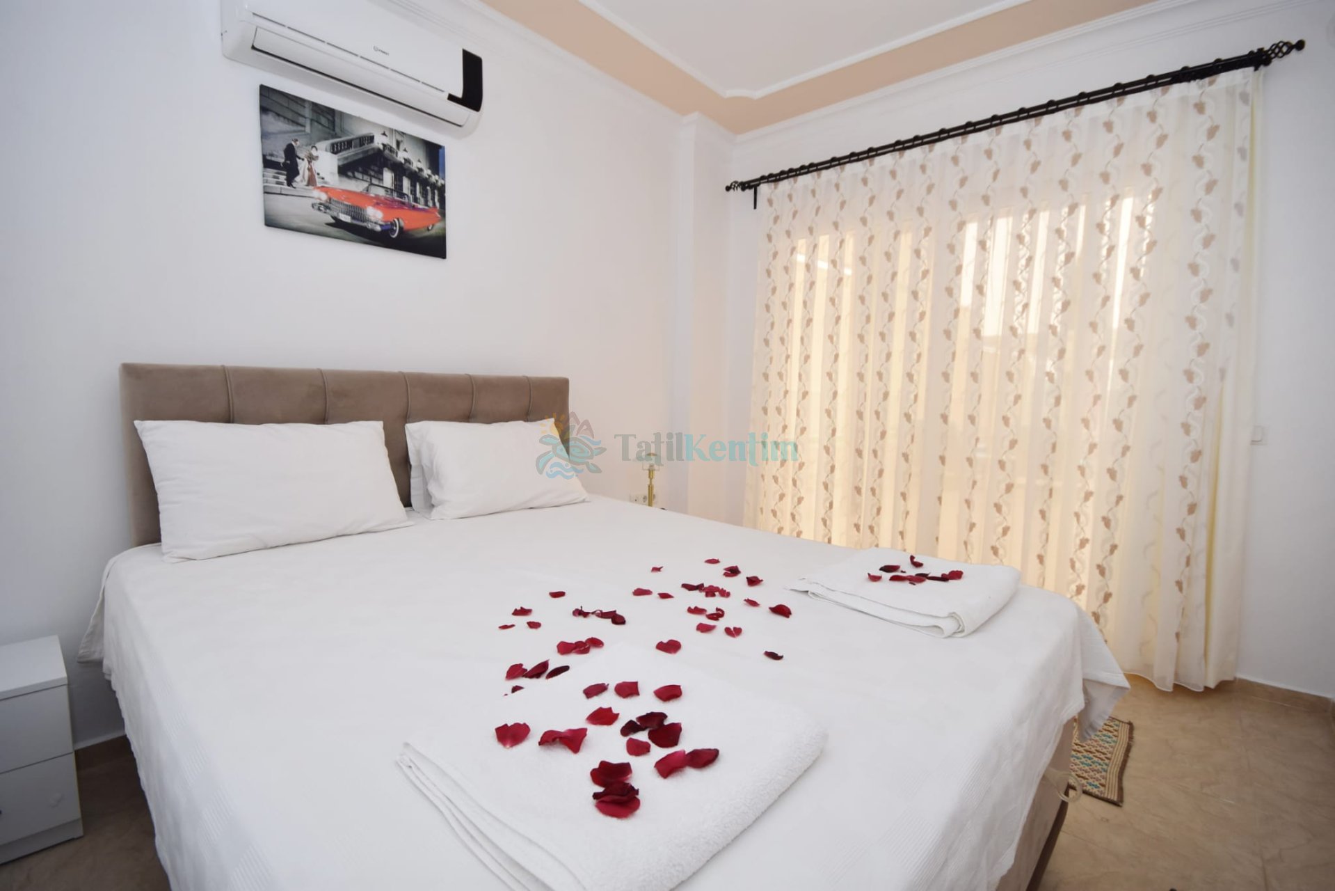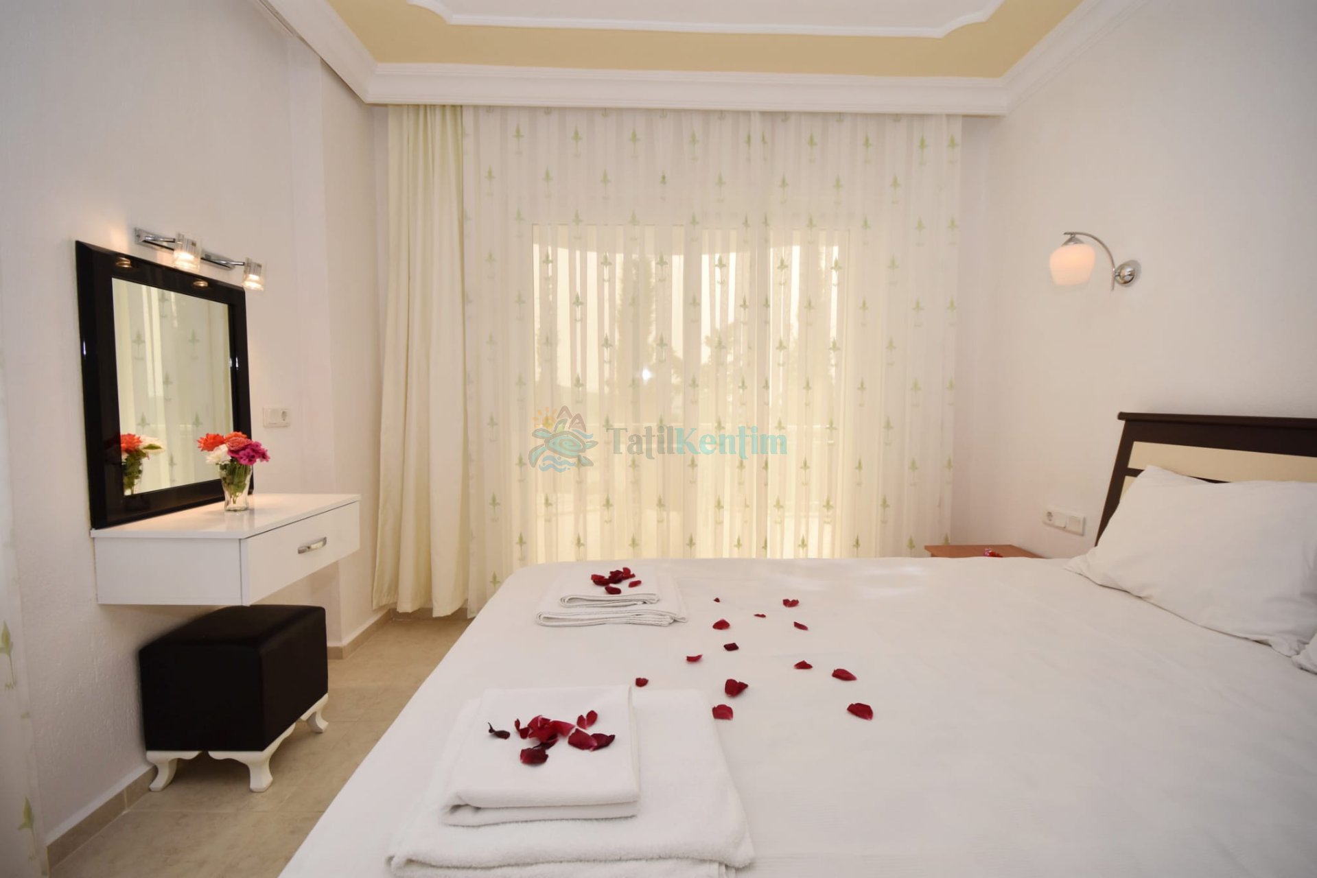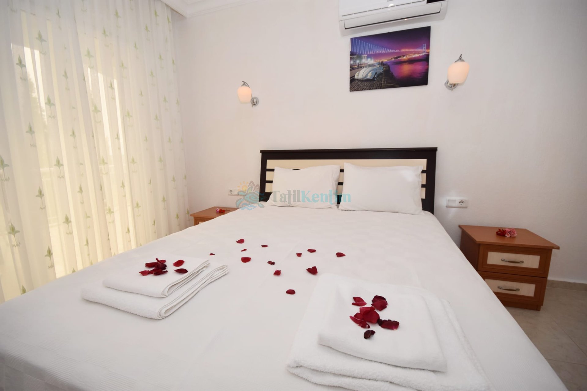 1.Yatak Odası: 1 adet çift kişilik yatak, klima, komodin, elbise dolabı, ortak kullanımda banyo ve tuvalet bulunmaktadır.