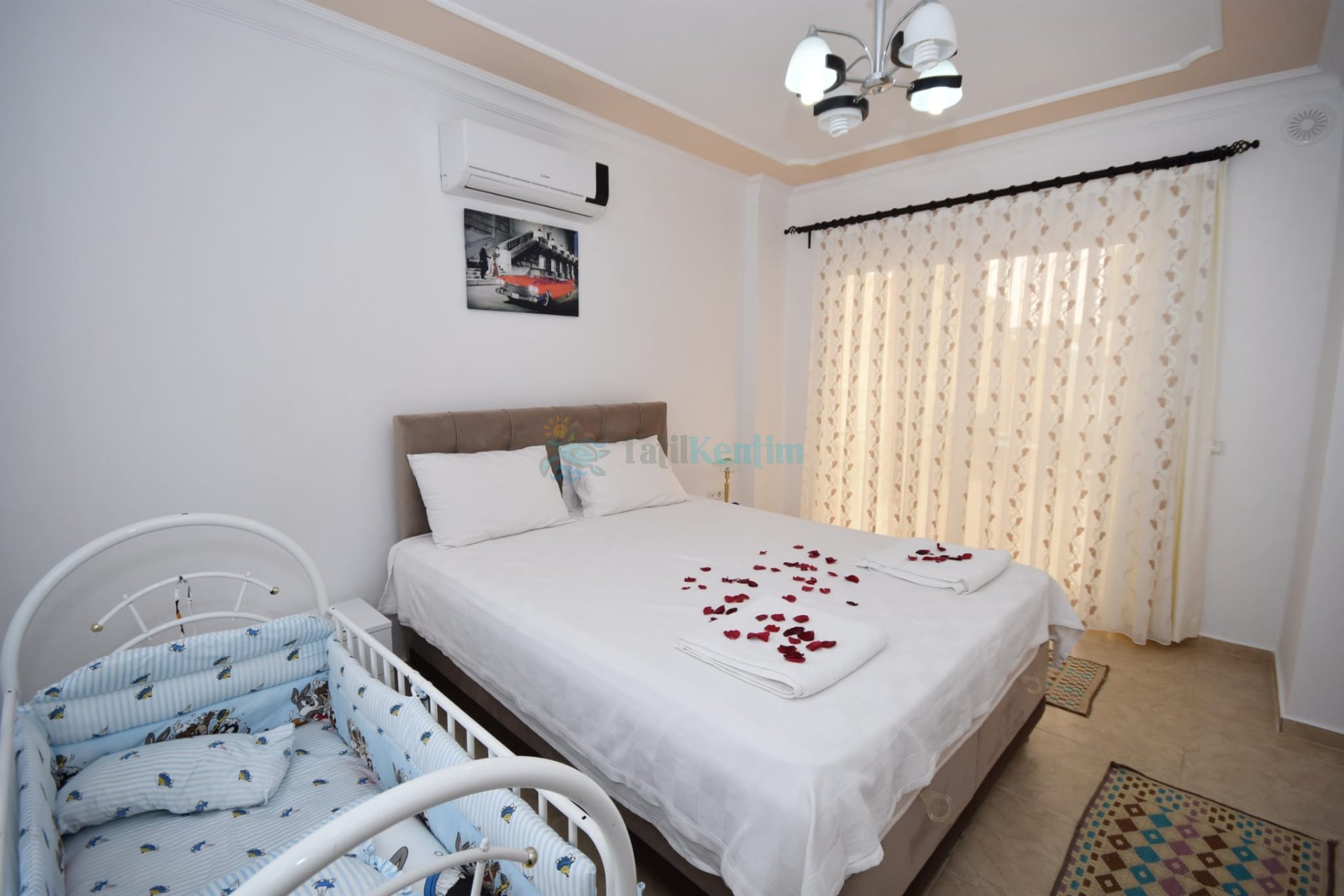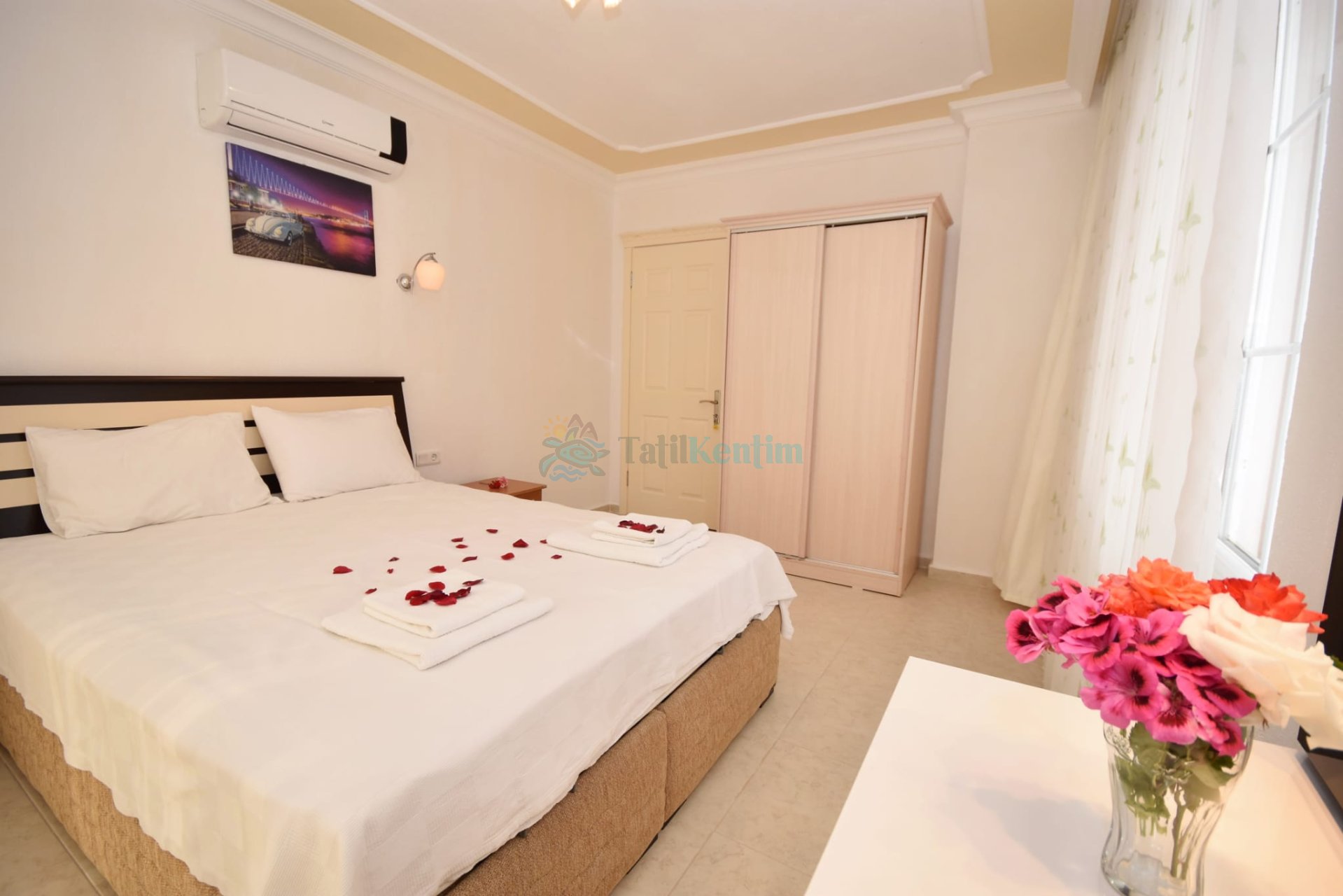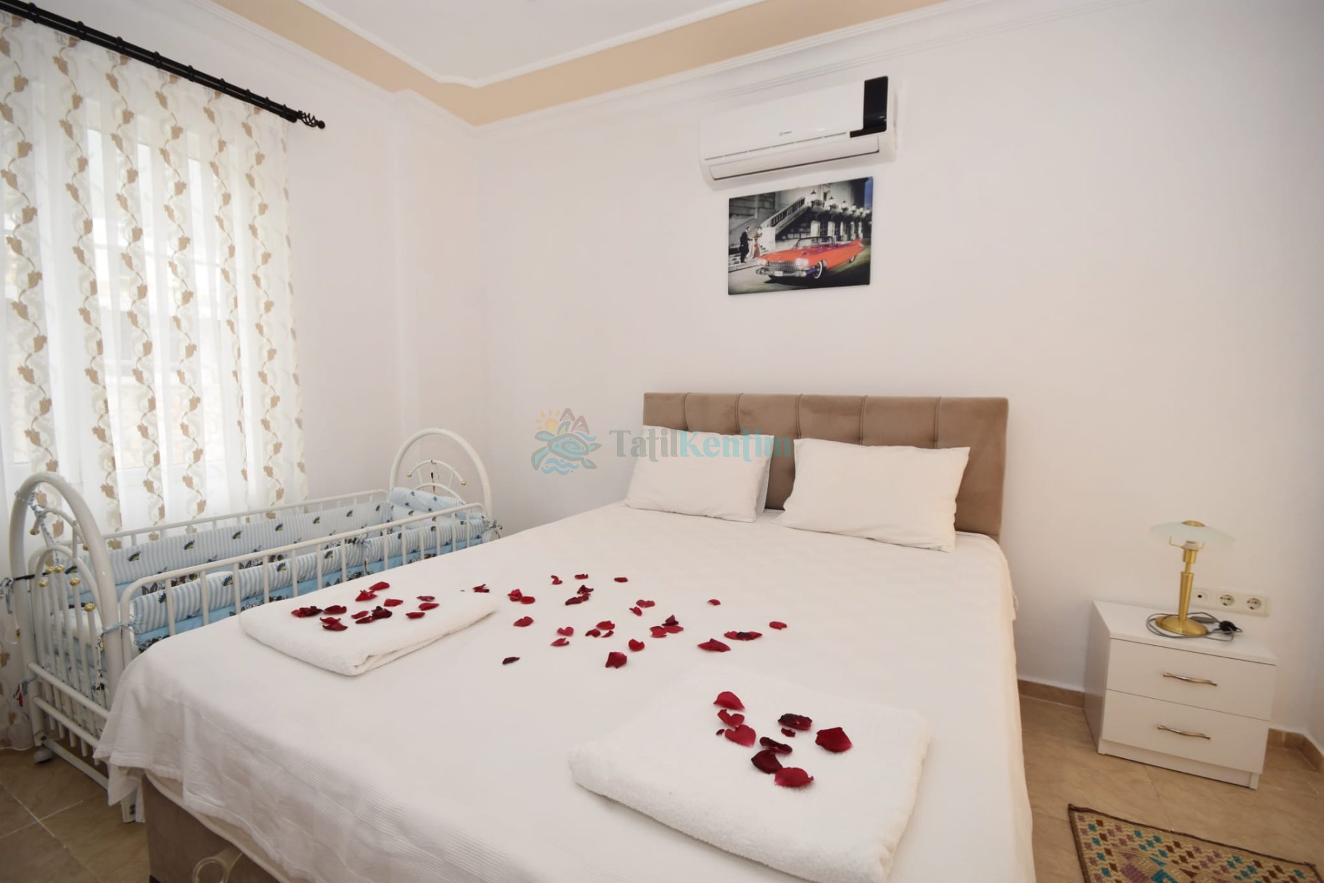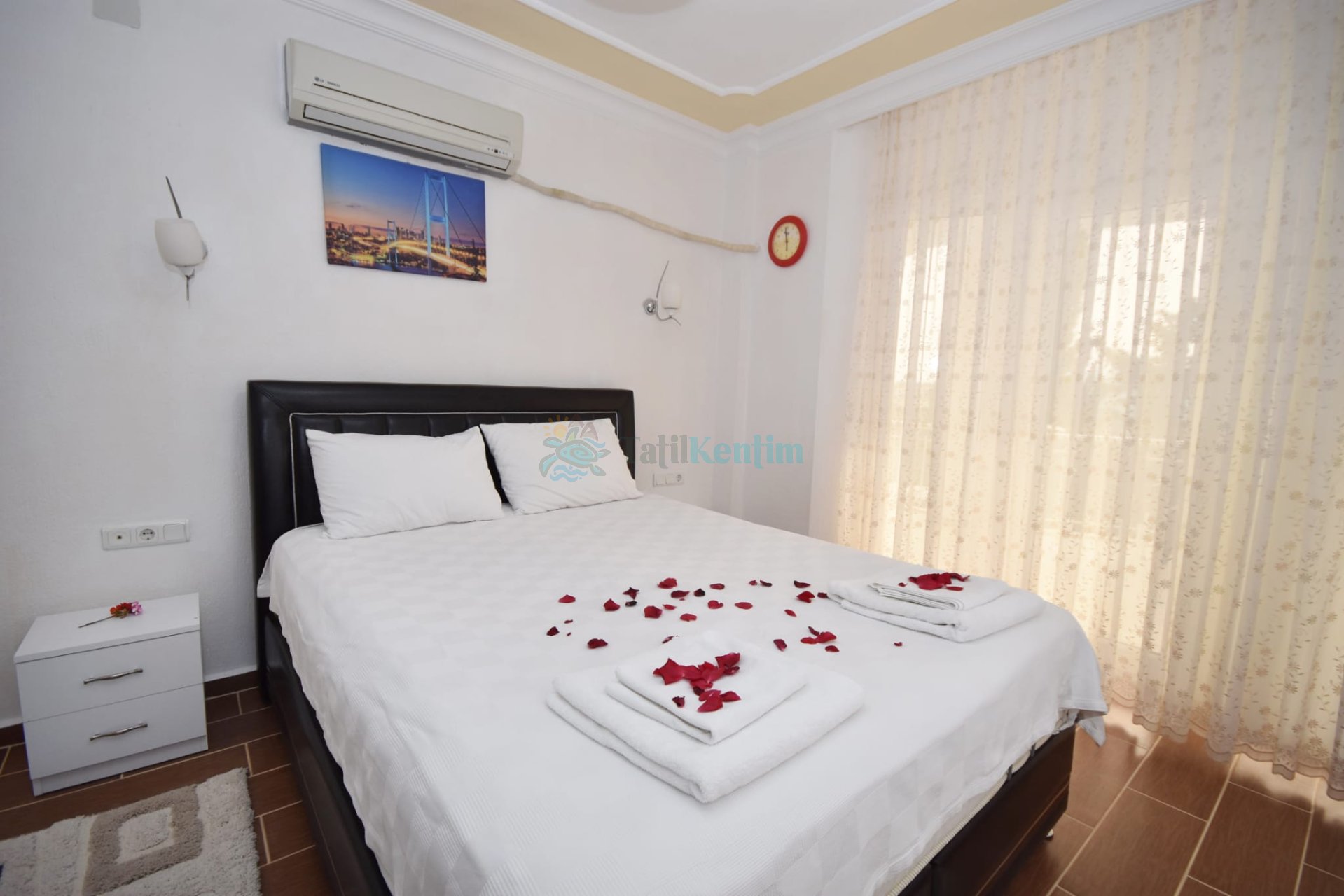 1.Yatak Odası: 1 adet çift kişilik yatak, klima, komodin, elbise dolabı, ortak kullanımda banyo ve tuvalet bulunmaktadır.