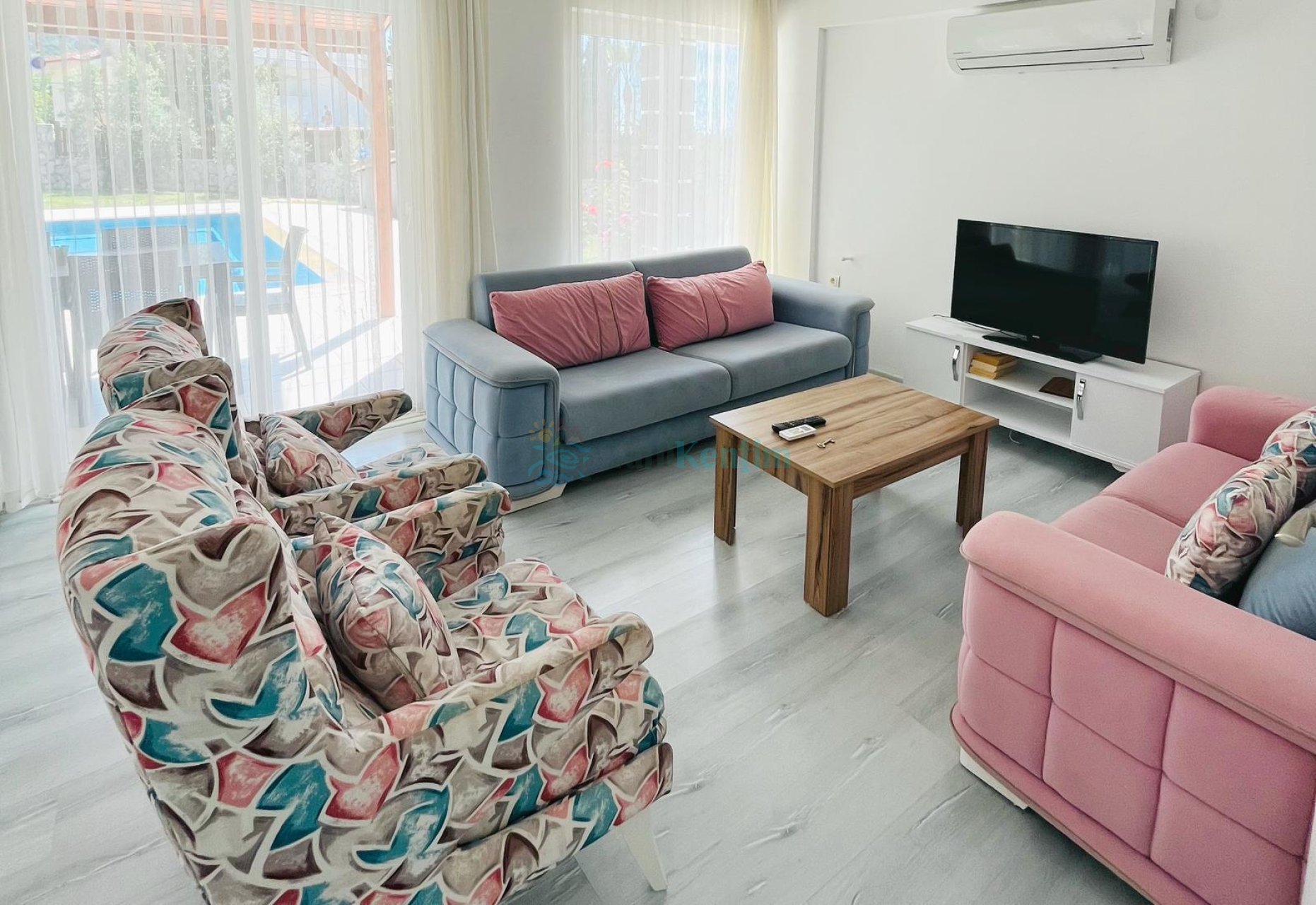Salon: Oturma grubu, Uydu TV, 8 Kişilik yemek masası, Klima, Havuz kenarına çıkış bulunmaktadır.